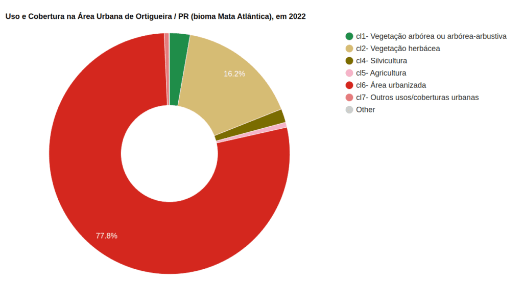 De acordo com o IBGE, a cidade tem ao menos uma árvore em 73,1% de suas vias, um valor que pode ser considerado mediano, e grande parte de sua cobertura vegetal urbana contabilizada pelo método do MapBiomas se dá por vegetação herbácea proveniente de um vazio urbano na região central do município, com representação de 16,2% da área, como pode ser visto na Figura 6.
